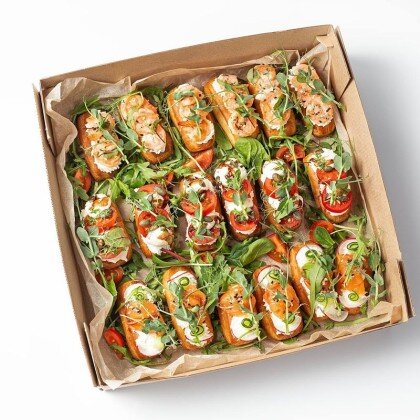 Сет «Ассорти брускетт» на 5 персон: мини-брускетта «Лосось-лайм» 6 шт, мини-брускетта «Лосось-манго» 6 шт